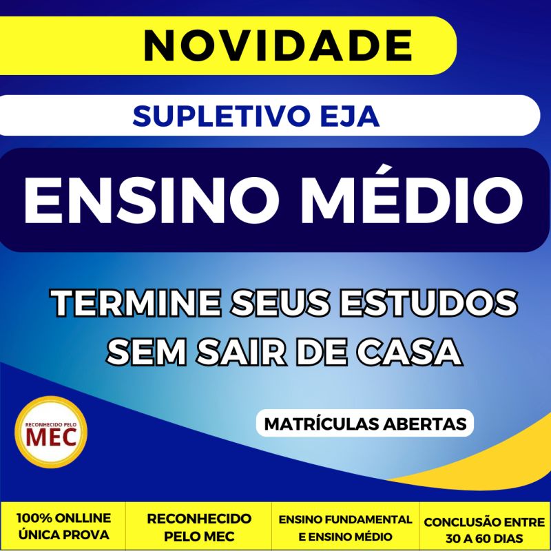 Conheça a melhor forma de alcançar seu diploma do ensino médio respondendo apenas oito provas com 10 questões cada. Faça sua inscrição e baixe a apostila de provas no site ou peça pelo WhatsApp da instituição: 61 99672-4064 e responda no conforto de sua casa.